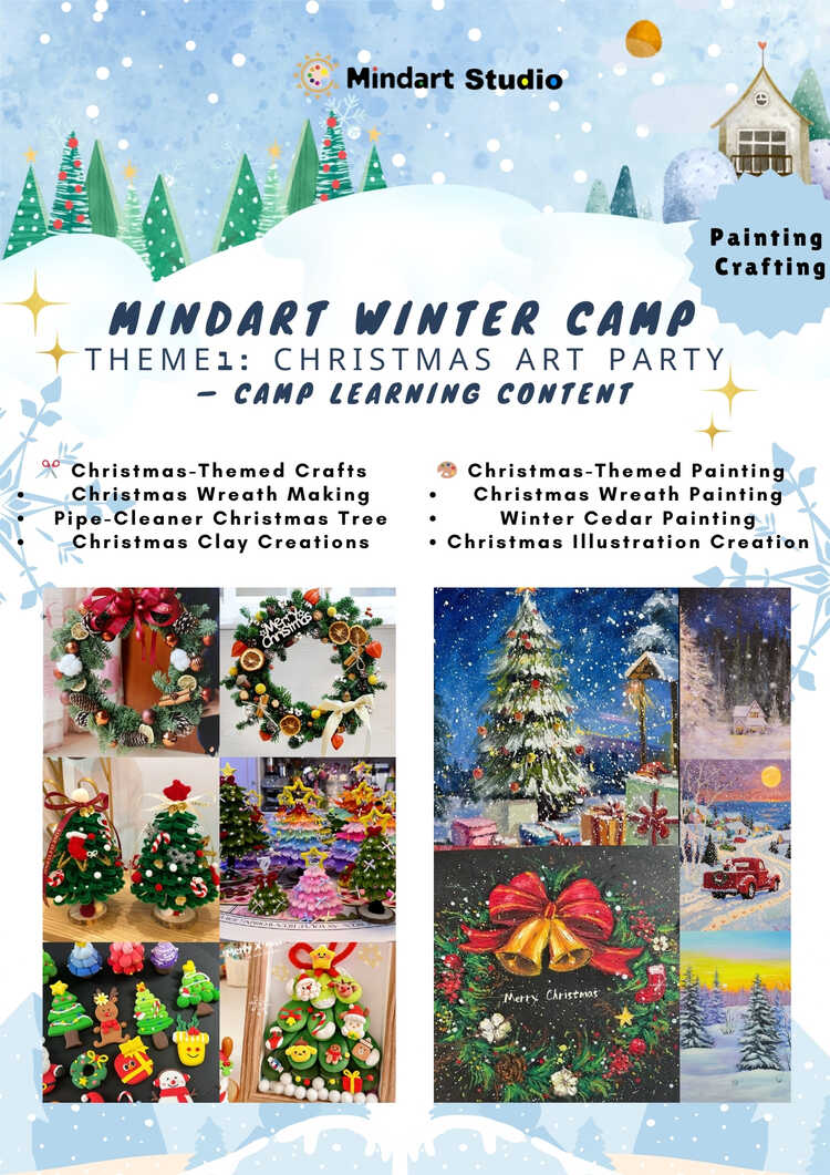 🎄 Christmas Art Party ✂️ Christmas-Themed Crafts * Christmas Wreath Making * Pipe-Cleaner Christmas Tree * Christmas Clay Creations 🎨 Christmas-Themed Painting * Christmas Wreath Painting * Winter Cedar Painting * Christmas Illustration Creation