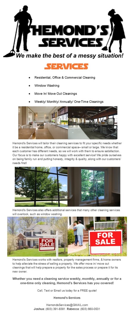 Hemond's Services is a professional, full-service cleaning company. We are family run and focus on our core values of honesty, integrity, and reliability. Our goal is to ensure that our customers are happy.