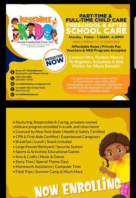 New York State licensed in-home childcare, offering full-time, part-time, drop-in care, after school care, and non-traditional hour services for children ages 6 weeks to 12 years old. We also offer transportation services for pickup and drop off.