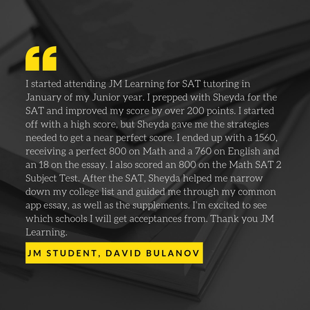 Our mission is to provide an exemplary educational program that becomes an investment toward the future of our students. We strive to foster an environment where we help our students grow into independent learners, from a young age and well into their college careers. JM Learning believes that you can only make the right decision, when you have the right information, and we are here to help.