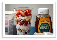 - Layer these ingredients (minus the honey), one at a time: Start with the yogurt, add berries on top, sprinkle granola and repeat.