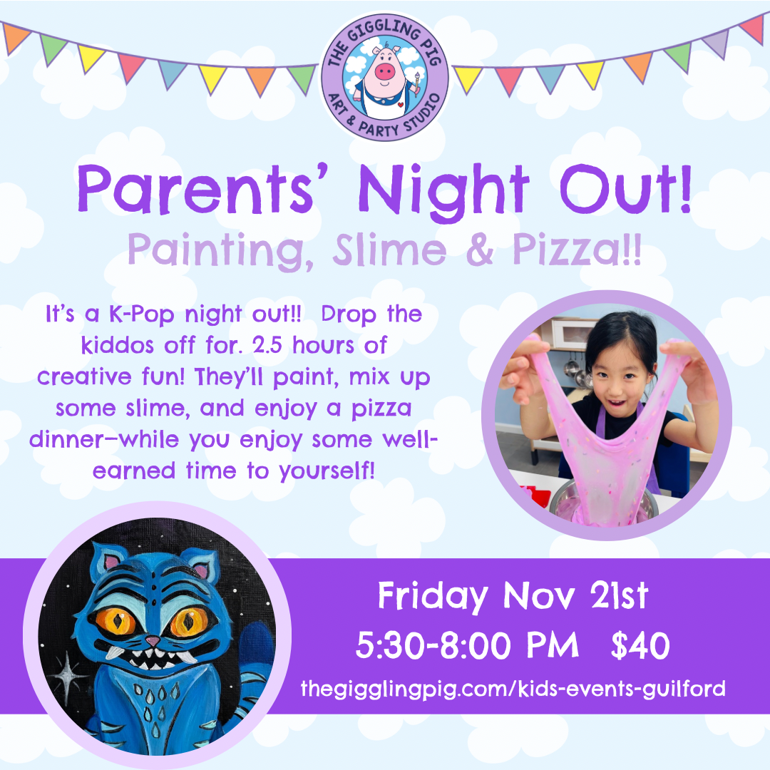 They get to enjoy a fun night here at the studio, and you get to enjoy some kid-free time!! It's a win-win! Each child will pick a craft to paint, make a custom batch of slime and enjoy some pizza!