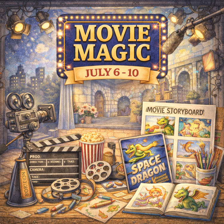 Lights, camera… imagination! During Movie Magic week, campers will explore the creative world behind the scenes of filmmaking. From designing sets and props to creating posters and storyboards, young artists will bring stories to life through art and movement. The week will culminate in a fun, low-pressure performance where campers showcase their creations and ideas on our very own “studio stage.”