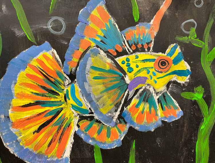Focusing on composition, color theory, and values, this class allows students to experiment with various medium techniques, including clay, watercolor, mixed media, acrylic, and tempera. 90 minutes. Ages 7-9. THIS WEEK: Join us as we dive into this colorful mandarin fish painting! Students will learn all about chiaroscuro and the use of contrast to create intensity in their art. In addition, they will utilize pattern and negative space as they bring their creation to life.