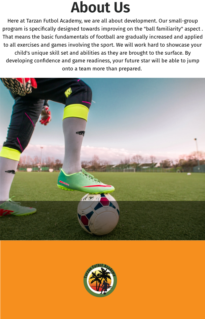 Here at Tarzan Futbol Academy, we are all about development. Our small-group training program is specifically designed towards improving on the "ball familiarity" aspect . That means the basic fundamentals of football are gradually increased and applied to all exercises and games involving the sport. We will work hard to showcase your child's unique skill set and abilities as they are brought to the surface. By developing confidence and game readiness, your future star will be able to jump onto a team more than prepared.