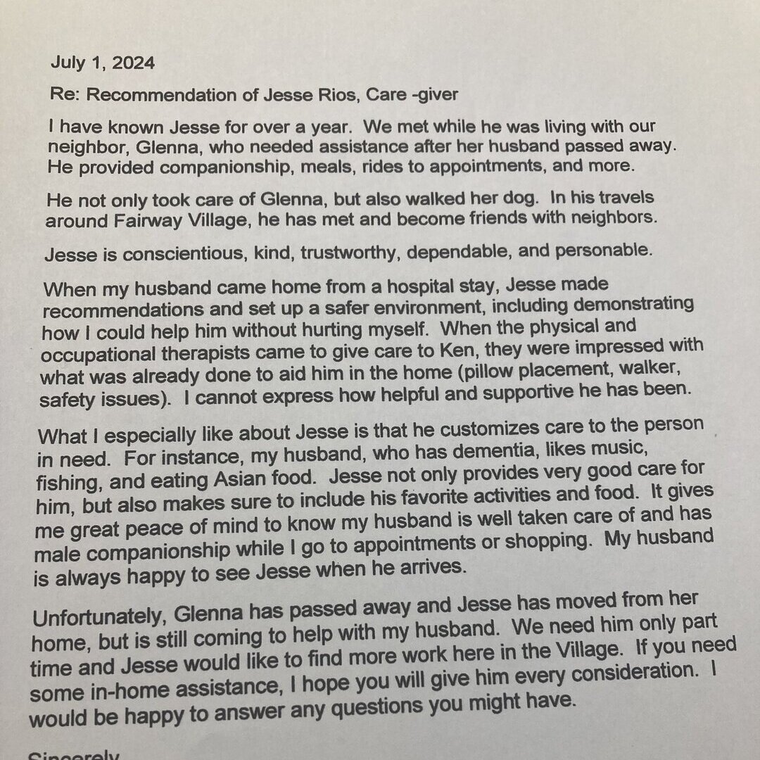 Jesse is almost too wonderful to be real! Between Christmas and New Year's (2022) our 86 year old father (J) was released into in home hospice. His 84 year old wife (G) has her own health issues and none of us have any nursing skills and all of us were kind shell shocked by the rapidly deteriorating situation. Jesse to the rescue: from his first shift, he showed a level of compassion, generosity, and expertise that simply can't be overstated. He only had 1 or 2 shifts before J was in a coma (such a shame, cause J would have got along with Jesse like a house on fire), but for the rest of J's life (a short week) Jesse brought Jazz/Blues music to play for J (J's favorite), he sat and talked with him, he washed him, shaved him, trimmed his hair, etc. He regularly massaged his limbs and moved him into different positions to make him comfortable/keep from getting bedsores. And he calmed & reassured G too. Now he keeps G company 6 evenings a week.